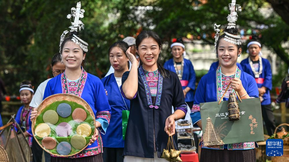 10月17日,在良口乡产口村活动现场,侗族群众在展示特色食品。