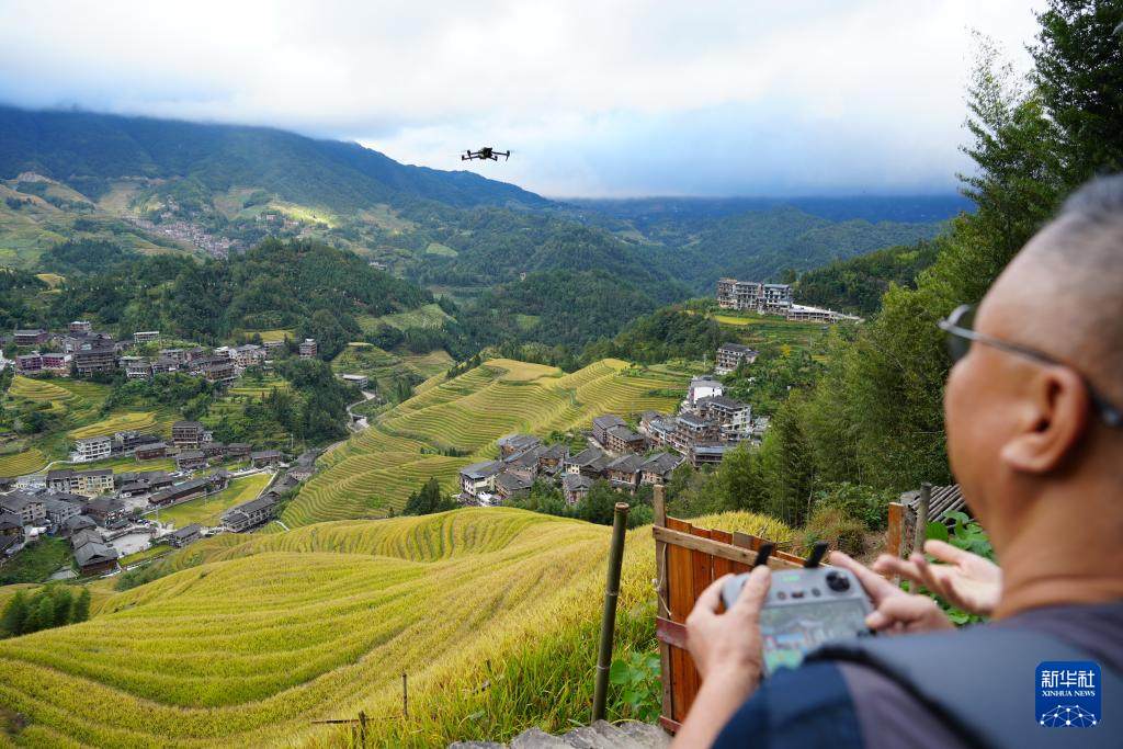 10月21日,在广西桂林市龙胜各族自治县,游客在用无人机拍摄龙脊梯田。