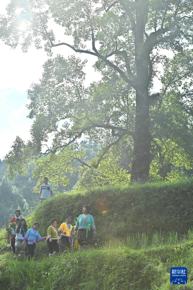 在广西柳州市融水苗族自治县杆洞乡党鸠村,村民和游客在田间从一棵树旁经过(2025年9月27日摄)。