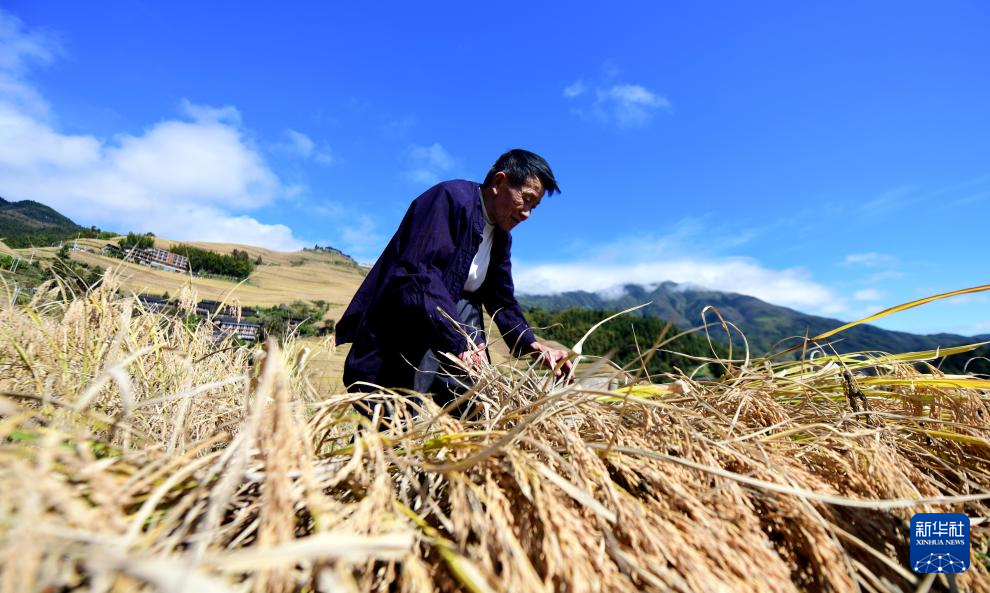 日前,广西桂林市龙胜各族自治县龙脊镇大寨村种植的水稻进入收获季节,梯田之上呈现出一派忙碌的景象。