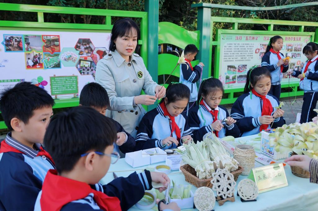 在埌东小学劳动“玉米系列”课程实践展示区,学生们在教师的指导下,有条不紊地开展剥玉米、煮玉米等实践操作,更巧妙的是用天然玉米皮创意编制特色小饰品,将劳动技能与审美创意相融合;在“棉花系列”课程实践展示区,学生们专注投入纺制棉线、缝制香囊等传统工艺实践,以沉浸式体验传承非遗。两大展示区通过丰富多样的劳动实践,全方位彰显劳动教育在知识传授、技能培养与文化传承中的多元价值,让劳动育人理念落地生根。