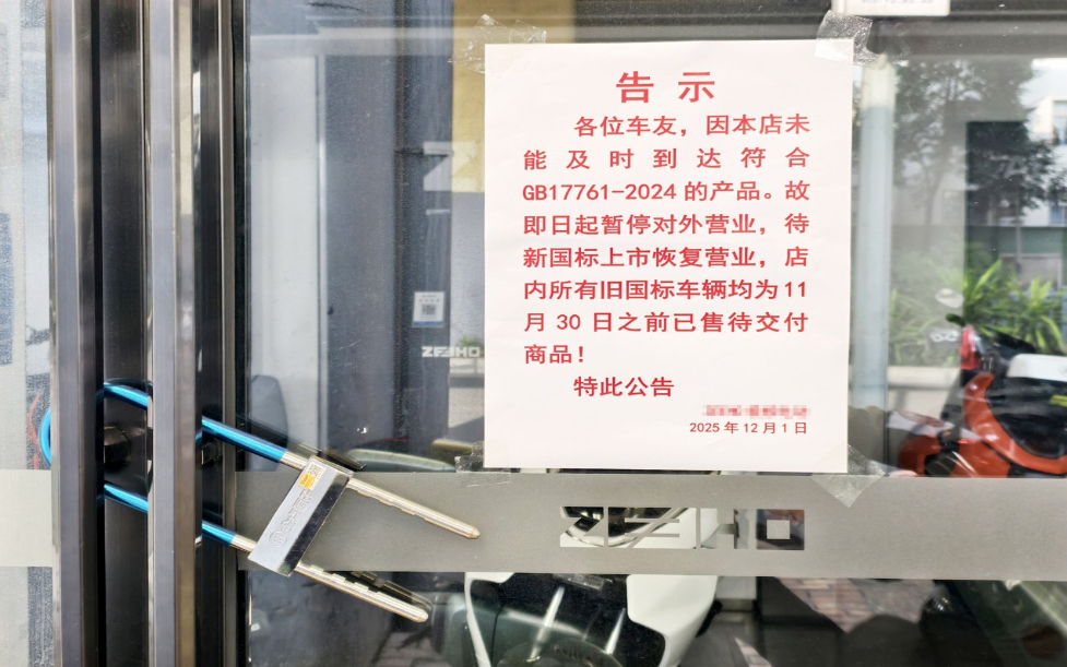 少数营业的店铺内,工作人员忙着将旧版标准车辆拆卸包装、集中装车。“上个月已经全力清库存了,但还是剩下十几辆旧标车,按照新规今日起绝对不能再卖,只能统一退回厂家处理。”一家店的店员告诉记者,为响应新国标实施,该店早在11月初就停止订购旧标车。但由于新国标对生产工艺要求大幅提升,上游厂家产能调整需要时间,合规新车供货延迟,“现在店里没车可卖,等新车到货再恢复正常营业”。