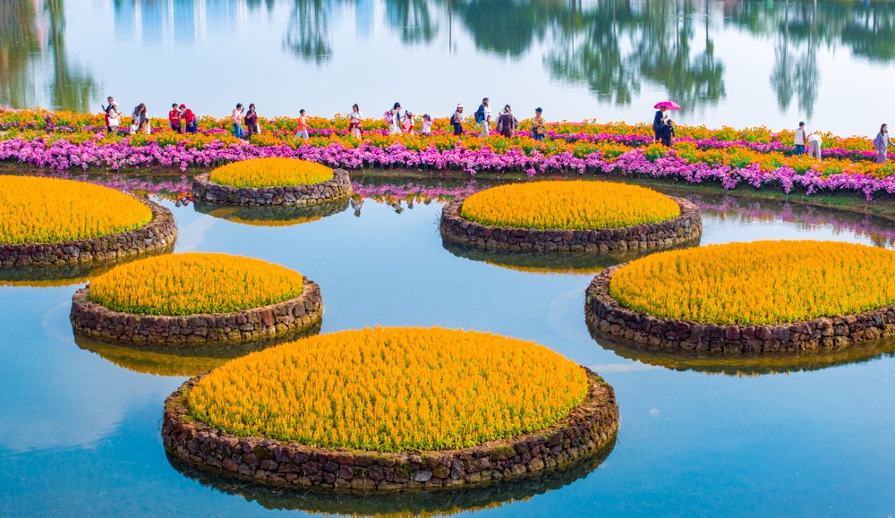 近期,广西南宁市青秀山风景区丘石花园的菊花进入盛花期,绚烂多彩的花海吸引众多游客前来赏花游玩。